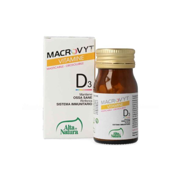 Fruttosio, Vitamina D3 Vegetale (Colecalciferolo). Coadiuvanti tecnologici: Mannitolo, Sorbitolo, Amido pregelatinizzato, Idrossipropilcellulosa, Magnesio Sterarato, Silice amorfa. Correttore di acidità: Acido Citrico. Edulcoranti: Stevia, Sucralosio. Aroma.