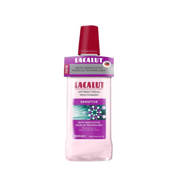 Lacalut Sensitive Antibacterial Mouthwash kujdeset për higjienën dentare dhe ofron ndihmë në rast të ndjeshmërisë së dhëmbëve dhe gingivave.