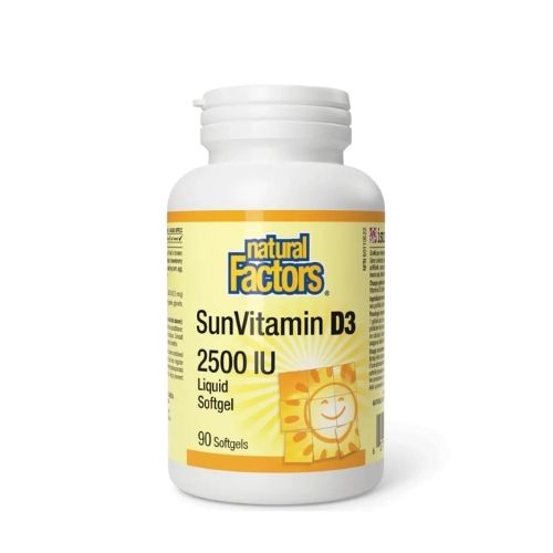 Sunvitamin D3 2500 IU nga Natural Factors ofron vitaminë D3 (kolekalciferol), një formë e vitaminës D e përdorur gjerësisht për të mbështetur mirëqenien e përditshme. Formula vjen në kapsula të buta (softgels) të bazuara në vaj liri organik, i cili shërben si bazë yndyrore për një marrje më të përshtatshme.