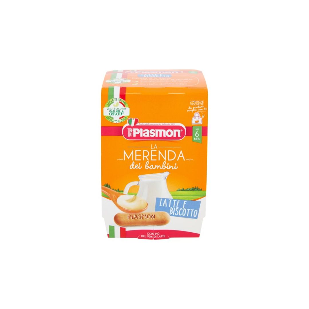 Plasmon biscuit (5%) (wheat flour, sugar, vegetable oils (sunflower, olive), skimmed milk powder, wheat starch, barley malt extract, raising agents (ammonium hydrogen carbonate, sodium hydrogen carbonate, diphosphate disodium), calcium carbonate, emulsifier: sunflower lecithin, flavors, iron fumarate, niacin, riboflavin, thiamine, vitamin B6)